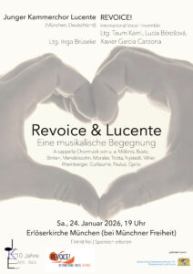 Gemeinsam mit dem renommierten Jungen Kammerchor Lucente gestaltet das internationale Ensemble am Sa., 24. Januar 2026, 19 Uhr in der Erlöserkirche München (bei der Münchner Freiheit) ein Fest der Chormusik mit feinster Chormusik a cappella aus Romantik und Moderne von u. a. Miškinis, Busto, Britten, Mendelssohn, Morales, Trotta, Nystedt, Miller, Rheinberger, Guillaume, Paulus, Gjeilo. REVOICE! wird geleitet von Taum Karni, Lucia Bérešová und Xavier Garcia Cardona, Lucente von Inga Brüseke.